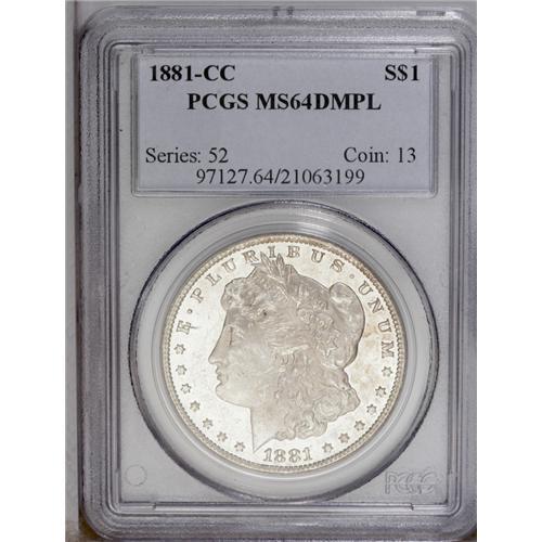 <B>1881-CC<img border='0' src='http://www.heritagecoins.com/images/star.gif' width=10 height=10>$1> MS64 Deep Mirror Prooflike PCGS.</B></I> Excellent field to motif contrast is evident over both sides of this essentially untoned CC issue. Sharply struck, with just a few luster grazes that define the grade.