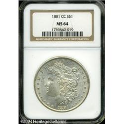 1881-CC S$1 MS64 NGC. Speckles of golden-gray colo <B>1881-CC S$1 MS64 NGC.</B></I> Speckles of golden-gray color occupy lustrous surfaces that exhibit well struck design features. Minute abrasions on the eagle's tail and legs limit the grade. <BR><BR><B>Important notice:</B> Heritage usually auctions material at the rate of 200-250 lots per hour. On some occasions eBay Live bid software or the Internet may not be able to keep up with the pace of the auction. We recommend placing a realistic absentee bid now as insurance to avoid disappointment. Occasionally the auctioneer may eliminate or reject an eBay Live bid, and the auctioneer may also reopen a lot after the close of the eBay live bidding (usually because we missed an audience bid), and may reject your bid even if it shows you as the winning bidder. By bidding via eBay Live, you agree that Heritage may award the lot to another bidder at its sole discretion under the circumstances described above or any other reasonable circumstances. Since eBay bids are not shown to us until we open the lot on the floor, we treat those bids just like floor bids. In most cases the floor responds before the eBay bid is presented to us, due to Internet lag time, so for consistency we have made it a policy that floor bids are always considered first over tie eBay live bids. Also please note that all Heritage lots purchased through eBay Live carry a 20% Buyer's Premium. Please make sure you read the Terms and Conditions before you bid. This lot is being auctioned in conjunction with a live floor auction by Heritage Galleries & Auctioneers. All final auction and invoice information will be supplied by Heritage Galleries & Auctioneers, and all other information should be considered preliminary. Lot:7378