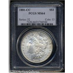 1881-CC S$1 MS64 PCGS. A lightly toned, crisply st <B>1881-CC S$1 MS64 PCGS.</B></I> A lightly toned, crisply struck, and lustrous representative of this popular low mintage CC-mint issue. The fields and the reverse are well preserved. <BR><BR><B>Important notice:</B> Heritage usually auctions material at the rate of 200-250 lots per hour. On some occasions eBay Live bid software or the Internet may not be able to keep up with the pace of the auction. We recommend placing a realistic absentee bid now as insurance to avoid disappointment. Occasionally the auctioneer may eliminate or reject an eBay Live bid, and the auctioneer may also reopen a lot after the close of the eBay live bidding (usually because we missed an audience bid), and may reject your bid even if it shows you as the winning bidder. By bidding via eBay Live, you agree that Heritage may award the lot to another bidder at its sole discretion under the circumstances described above or any other reasonable circumstances. Since eBay bids are not shown to us until we open the lot on the floor, we treat those bids just like floor bids. In most cases the floor responds before the eBay bid is presented to us, due to Internet lag time, so for consistency we have made it a policy that floor bids are always considered first over tie eBay live bids. Also please note that all Heritage lots purchased through eBay Live carry a 20% Buyer's Premium. Please make sure you read the Terms and Conditions before you bid. This lot is being auctioned in conjunction with a live floor auction by Heritage Galleries & Auctioneers. All final auction and invoice information will be supplied by Heritage Galleries & Auctioneers, and all other information should be considered preliminary. Lot:7380