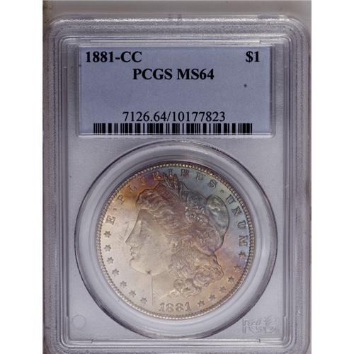 <B>1881-CC<img border='0' src='http://www.heritagecoins.com/images/star.gif' width=10 height=10>$1> MS64 PCGS.</B></I> The obverse is magnificently toned in orange, plum, and blue-green shades. The reverse is nearly brilliant. Booming luster and an exacting strike contribute further to the quality. A popular low mintage issue.