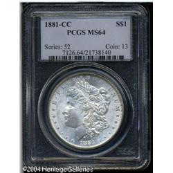 1881-CC S$1 MS64 PCGS. This crisply struck Carson <B>1881-CC S$1 MS64 PCGS.</B></I> This crisply struck Carson City Dollar has a hint of tan color and potent cartwheel luster. The low mintage of the 1881-CC has long made the issue a collector favorite. <BR><BR><B>Important notice:</B> Heritage usually auctions material at the rate of 200-250 lots per hour. On some occasions eBay Live bid software or the Internet may not be able to keep up with the pace of the auction. We recommend placing a realistic absentee bid now as insurance to avoid disappointment. Occasionally the auctioneer may eliminate or reject an eBay Live bid, and the auctioneer may also reopen a lot after the close of the eBay live bidding (usually because we missed an audience bid), and may reject your bid even if it shows you as the winning bidder. By bidding via eBay Live, you agree that Heritage may award the lot to another bidder at its sole discretion under the circumstances described above or any other reasonable circumstances. Since eBay bids are not shown to us until we open the lot on the floor, we treat those bids just like floor bids. In most cases the floor responds before the eBay bid is presented to us, due to Internet lag time, so for consistency we have made it a policy that floor bids are always considered first over tie eBay live bids. Also please note that all Heritage lots purchased through eBay Live carry a 20% Buyer's Premium. Please make sure you read the Terms and Conditions before you bid. This lot is being auctioned in conjunction with a live floor auction by Heritage Galleries & Auctioneers. All final auction and invoice information will be supplied by Heritage Galleries & Auctioneers, and all other information should be considered preliminary. Lot:7379