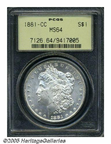 <B>1881-CC<S$1> MS64 PCGS.</B></I> Well struck and highly lustrous, with a moderately abraded obverse and a very clean, semi-prooflike reverse, this near-Gem has nice eye appeal and plenty of flash.<BR><I>From The Milwaukee Shore Collection.</B></I>