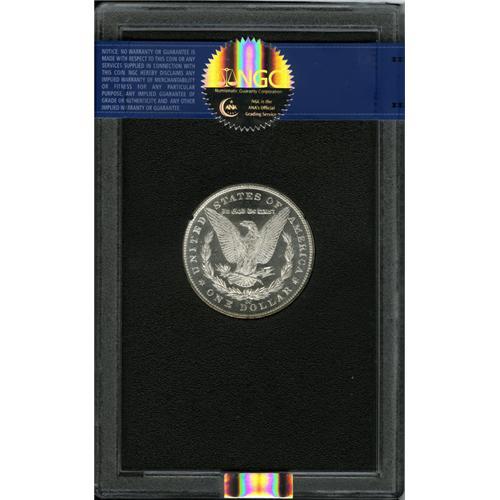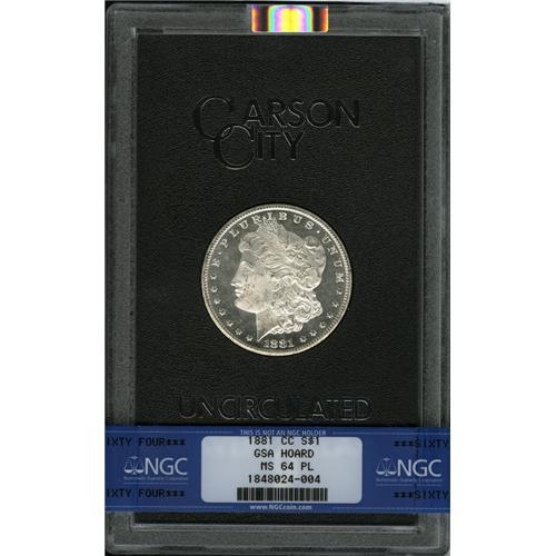 <B>1881-CC<img border='0' src='http://www.heritagecoins.com/images/star.gif' width=10 height=10>$1> MS64 Prooflike NGC.</B></I> Impressively mirrored fields approach a Deep Mirror designation. The devices are nicely frosted, and demonstrate pleasing contrast. This exactingly struck and carefully preserved piece exhibits imposing eye appeal. A used black GSA box accompanies the lot.