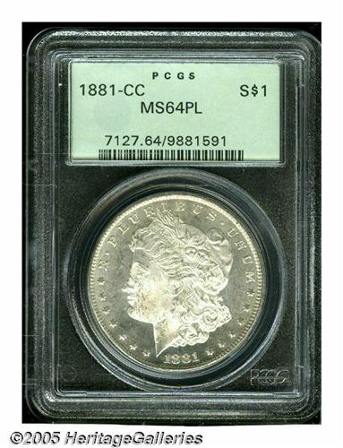 <B>1881-CC<S$1> MS64 Prooflike PCGS.</B></I> A sharply struck and lightly toned example that has mild cameo contrast in addition to the mirrored fields. There is a speck of PVC residue above the ear of Liberty. Encapsulated in a green label holder.