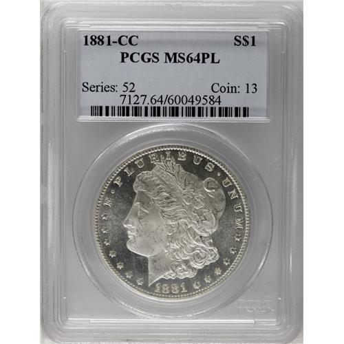 <B>1881-CC<img border='0' src='http://www.heritagecoins.com/images/star.gif' width=10 height=10>$1> MS64 Prooflike PCGS.</B></I> The frosted devices have rose toning on Liberty's cheek and the eagle, in contrast with the brilliant and minimally abraded mirrors. The spectacular reverse would add Carson City cachet to a prooflike type set.<BR><I>From The Chicago-Ark Collection.</B></I>