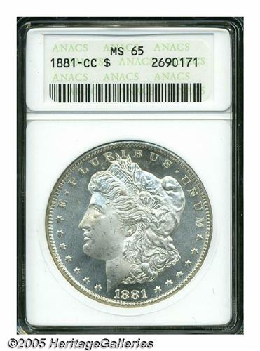<B>1881-CC<S$1> MS65 ANACS.</B></I> A brilliant Gem example that exhibits frosty devices and fields that have a texture intermediate between satiny and mirrorlike.