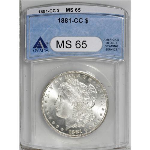 <B>1881-CC<img border='0' src='http://www.heritagecoins.com/images/star.gif' width=10 height=10>$1> MS65 ANACS.</B></I> Fully brilliant with exquisite frosty white luster and sharp design details. Although not a rare date, this issue is always in demand in Gem condition.