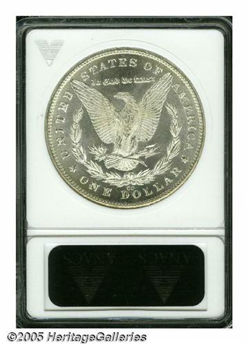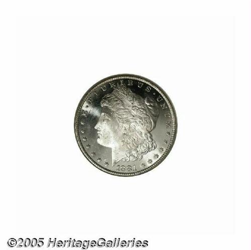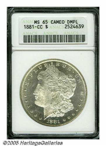 <B>1881-CC<S$1> MS65 Deep Mirror Prooflike ANACS.</B></I> This issue is one of the common Carson City Mint Silver Dollars in Mint State grades, with prices at higher levels than the following three years, due to the overall low production. Nearly all of this mintage remained in the Treasury for many years, and even in the 1970s, the GSA inventory showed that almost half the original mintage remained on hand, some 90 years later. Prooflike examples of this issue are quite rare. This one has extremely deep mirrored fields and highly frosted devices. The surfaces on both sides are fully brilliant.