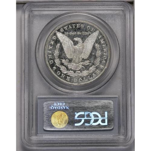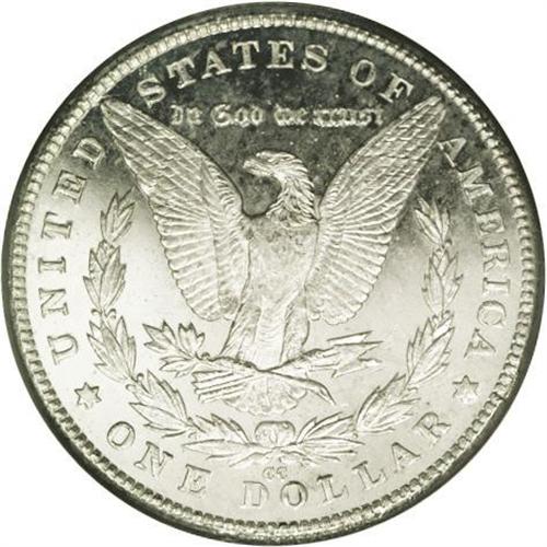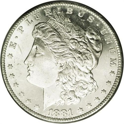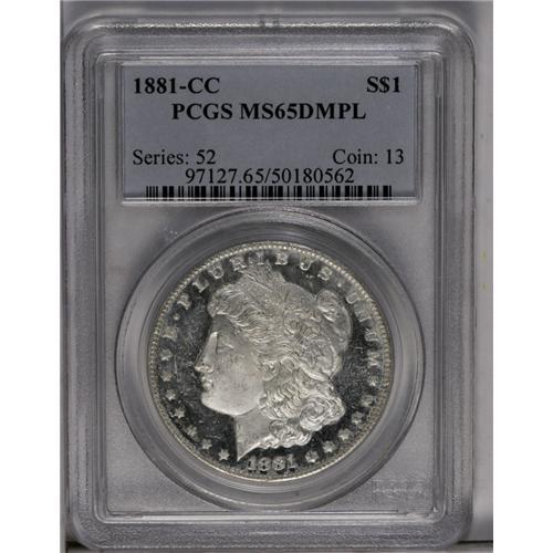 <B>1881-CC<img border='0' src='http://www.heritagecoins.com/images/star.gif' width=10 height=10>$1> MS65 Deep Mirror Prooflike PCGS.</B></I> Fully brilliant and, while the depth of reflectivity just merits DMPL status, nicely frosted devices result in excellent contrast. A few trivial frost breaks and contact marks on the cheek and obverse field do not overly detract, and the balance of the coin is nearly impeccable.