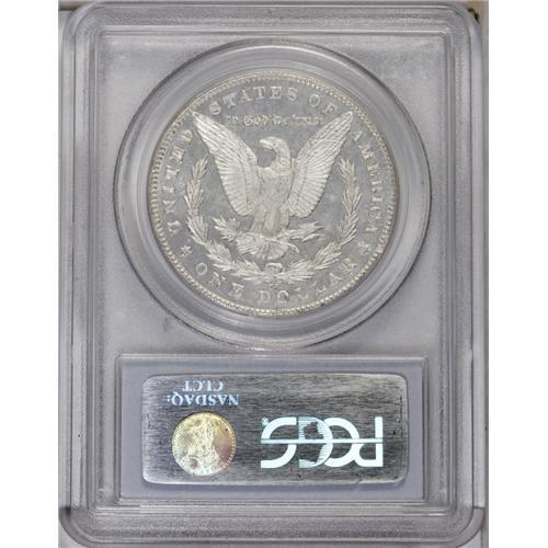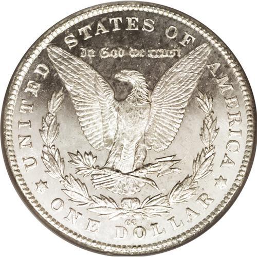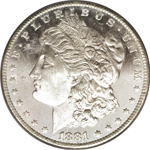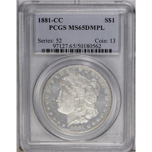 <B>1881-CC<img border='0' src='http://www.heritagecoins.com/images/star.gif' width=10 height=10>$1> MS65 Deep Mirror Prooflike PCGS.</B></I> Fully brilliant and, while the depth of reflectivity just merits DMPL status, nicely frosted devices result in excellent contrast. A few trivial frost breaks and contact marks on the cheek and obverse field do not overly detract, and the balance of the coin is nearly impeccable.
