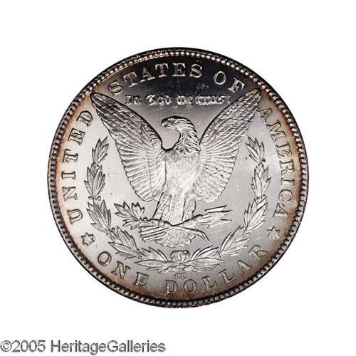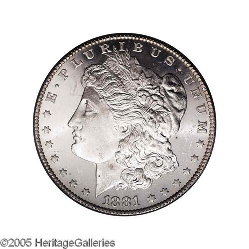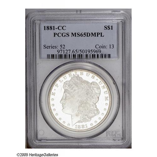<B>1881-CC<S$1> MS65 Deep Mirror Prooflike PCGS.</B></I> This is a wonderful Gem with deeply mirrored fields and exceptional cameo contrast. The devices are fully lustrous and brilliant. Neither side has any toning, except for wispy gold color along the reverse border. This is one of the <I>deepest</B></I> deep mirror prooflike examples that could be imagined. Population: 176 in 65 DMPL, 43 finer (12/05).