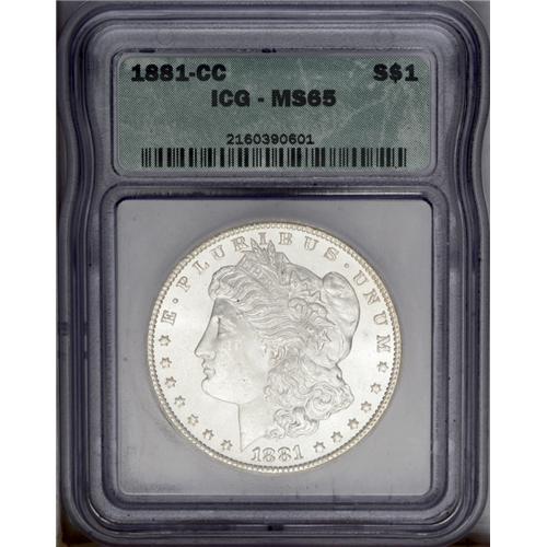 <B>1881-CC<img border='0' src='http://www.heritagecoins.com/images/star.gif' width=10 height=10>$1> MS65 ICG.</B></I> Excellent definition is seen on the design elements, including in the hair over Liberty's ear, and nice luster enlivens both sides. Minute abrasions in the left obverse field and on Liberty's cheek are mentioned for accuracy. <BR><BR><B>Important notice:</B> Heritage usually auctions material at the rate of 200-250 lots per hour. On some occasions eBay Live bid software or the Internet may not be able to keep up with the pace of the auction. We recommend placing a realistic absentee bid now as insurance to avoid disappointment. Occasionally the auctioneer may eliminate or reject an eBay Live bid, and the auctioneer may also reopen a lot after the close of the eBay live bidding (usually because we missed an audience bid), and may reject your bid even if it shows you as the winning bidder. By bidding via eBay Live, you agree that Heritage may award the lot to another bidder at its sole discretion under the circumstances described above or any other reasonable circumstances. Since eBay bids are not shown to us until we open the lot on the floor, we treat those bids just like floor bids. In most cases the floor responds before the eBay bid is presented to us, due to Internet lag time, so for consistency we have made it a policy that floor bids are always considered first over tie eBay live bids. Also please note that all Heritage lots purchased through eBay Live carry a 20% Buyer's Premium. Please make sure you read the Terms and Conditions before you bid. This lot is being auctioned in conjunction with a live floor auction by Heritage Galleries & Auctioneers. All final auction and invoice information will be supplied by Heritage Galleries & Auctioneers, and all other information should be considered preliminary. Lot:3312 <BR><BR><B>Winning Notification and Billing:</B> After the FINAL session in this auction is complete, Heritage will send e-mail and snail mail invoices. This process normally takes several days. All final auction and invoice information will be supplied by Heritage Galleries & Auctioneers, and all other information should be considered preliminary. <BR><BR>This auction will be conducted on a live auction floor and over the Internet through eBay Live. If you choose to place an absentee bid, please take a moment to <font color='#0000ff'><u><a href='http://pages.ebay.com/liveauctions/help/before/laabsentee.html'>learn how eBay Live absentee bidding works</a></u></font><font color='#000000'>