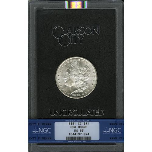 <B>1881-CC<img border='0' src='http://www.heritagecoins.com/images/star.gif' width=10 height=10>$1> MS65 NGC.</B></I> This lustrous and virtually brilliant Gem is intricately struck and pleasantly preserved. The fields are especially clean. The low mintage of the 1881-CC places it among the most popular GSA issues. <BR><BR><B>Important notice:</B> Heritage usually auctions material at the rate of 200-250 lots per hour. On some occasions eBay Live bid software or the Internet may not be able to keep up with the pace of the auction. We recommend placing a realistic absentee bid now as insurance to avoid disappointment. Occasionally the auctioneer may eliminate or reject an eBay Live bid, and the auctioneer may also reopen a lot after the close of the eBay live bidding (usually because we missed an audience bid), and may reject your bid even if it shows you as the winning bidder. By bidding via eBay Live, you agree that Heritage may award the lot to another bidder at its sole discretion under the circumstances described above or any other reasonable circumstances. Since eBay bids are not shown to us until we open the lot on the floor, we treat those bids just like floor bids. In most cases the floor responds before the eBay bid is presented to us, due to Internet lag time, so for consistency we have made it a policy that floor bids are always considered first over tie eBay live bids. Also please note that all Heritage lots purchased through eBay Live carry a 20% Buyer's Premium. Please make sure you read the Terms and Conditions before you bid. This lot is being auctioned in conjunction with a live floor auction by Heritage Galleries & Auctioneers. All final auction and invoice information will be supplied by Heritage Galleries & Auctioneers, and all other information should be considered preliminary. Lot:5434 <BR><BR><B>Winning Notification and Billing:</B> After the FINAL session in this auction is complete, Heritage will send e-mail and snail mail invoices. This process normally takes several days. All final auction and invoice information will be supplied by Heritage Galleries & Auctioneers, and all other information should be considered preliminary. <BR><BR>This auction will be conducted on a live auction floor and over the Internet through eBay Live. If you choose to place an absentee bid, please take a moment to <font color='#0000ff'><u><a href='http://pages.ebay.com/liveauctions/help/before/laabsentee.html'>learn how eBay Live absentee bidding works</a></u></font><font color='#000000'>