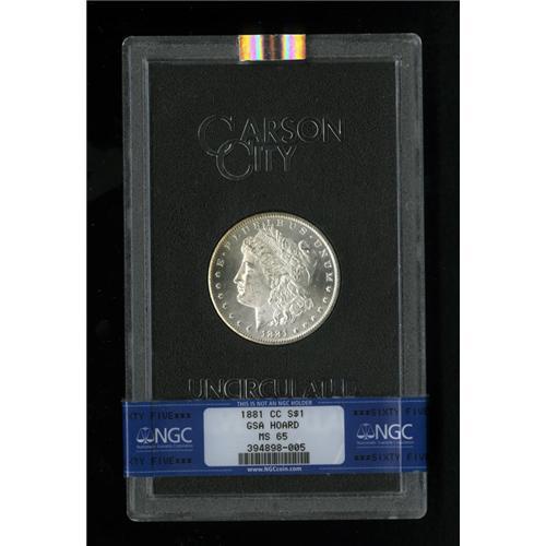 <B>1881-CC<img border='0' src='http://www.heritagecoins.com/images/star.gif' width=10 height=10>$1> MS65 NGC.</B></I> A lustrous and needle-sharp Gem that has booming luster and a blush of peach color along the lower left reverse border. The fields are beautifully preserved. Housed in the original holder with an NGC seal.