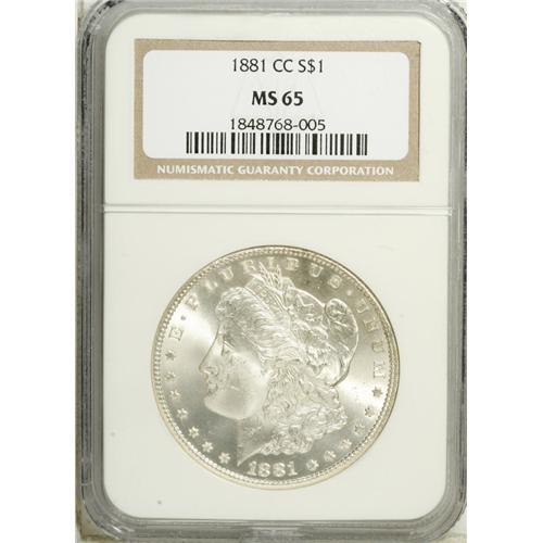 <B>1881-CC S$1 MS65 NGC.</B></I> Potent luster adorns both sides of this lovely Gem. The design elements are well executed, with great delineation apparent in the hair over Liberty's ear and on the breast feathers.<BR><BR><b>Shipping:</b> Coin/Currency (<a target="_blank" href="http://www.heritageauctions.com/common/shipping.php">view shipping information</a>)