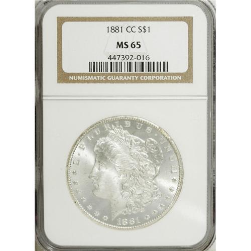 <B>1881-CC S$1 MS65 NGC.</B></I> Silver-gray surfaces exhibit just a wisp or two of light tan-gold color, and offer noticeable contrast between the devices and partially prooflike fields. Some minute obverse marks prevent the achievement of a higher grade.<BR><BR><b>Shipping:</b> Coins & Currency (<a target="_blank" href="http://www.heritageauctions.com/common/shipping.php">view shipping information</a>)