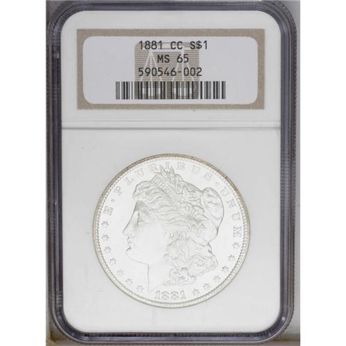 <B>1881-CC<img border='0' src='http://www.heritagecoins.com/images/star.gif' width=10 height=10>$1> MS65 NGC.</B></I> This lustrous and low mintage Gem is impressively struck. The cheek is clean, and the fields are nearly immaculate. A hint of gold toning denies complete brilliance. <BR><BR><B>Important notice:</B> Heritage usually auctions material at the rate of 200-250 lots per hour. On some occasions eBay Live bid software or the Internet may not be able to keep up with the pace of the auction. We recommend placing a realistic absentee bid now as insurance to avoid disappointment. Occasionally the auctioneer may eliminate or reject an eBay Live bid, and the auctioneer may also reopen a lot after the close of the eBay live bidding (usually because we missed an audience bid), and may reject your bid even if it shows you as the winning bidder. By bidding via eBay Live, you agree that Heritage may award the lot to another bidder at its sole discretion under the circumstances described above or any other reasonable circumstances. Since eBay bids are not shown to us until we open the lot on the floor, we treat those bids just like floor bids. In most cases the floor responds before the eBay bid is presented to us, due to Internet lag time, so for consistency we have made it a policy that floor bids are always considered first over tie eBay live bids. Also please note that all Heritage lots purchased through eBay Live carry a 20% Buyer's Premium. Please make sure you read the Terms and Conditions before you bid. This lot is being auctioned in conjunction with a live floor auction by Heritage Galleries & Auctioneers. All final auction and invoice information will be supplied by Heritage Galleries & Auctioneers, and all other information should be considered preliminary. Lot:3310 <BR><BR><B>Winning Notification and Billing:</B> After the FINAL session in this auction is complete, Heritage will send e-mail and snail mail invoices. This process normally takes several days. All final auction and invoice information will be supplied by Heritage Galleries & Auctioneers, and all other information should be considered preliminary. <BR><BR>This auction will be conducted on a live auction floor and over the Internet through eBay Live. If you choose to place an absentee bid, please take a moment to <font color='#0000ff'><u><a href='http://pages.ebay.com/liveauctions/help/before/laabsentee.html'>learn how eBay Live absentee bidding works</a></u></font><font color='#000000'>