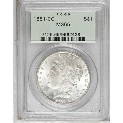<B>1881-CC<img border='0' src='http://www.heritagecoins.com/images/star.gif' width=10 height=10>$1> MS65 PCGS.</B></I> A sharply struck Gem with average luster. Wisps of brick-red toning appear on both sides of this piece, housed in a green label holder.