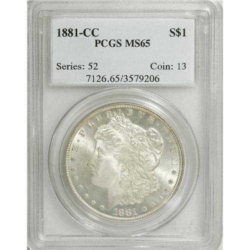 <B>1881-CC S$1 MS65 PCGS.</B></I> A well executed strike translates into sharp definition on the design elements, including the hair over Liberty's ear and the eagle's breast feathers. Moreover, partially prooflike fields highlight the motifs, irrespective of the angle from which the coin is viewed. Faint wisps of tan are noted on each side, though many would simply say the coin is "untoned." This piece is quite close to the next highest grade, as just a few minor luster grazes stand in the way.<BR><BR><b>Shipping:</b> Coins & Currency (<a target="_blank" href="http://www.heritageauctions.com/common/shipping.php">view shipping information</a>)