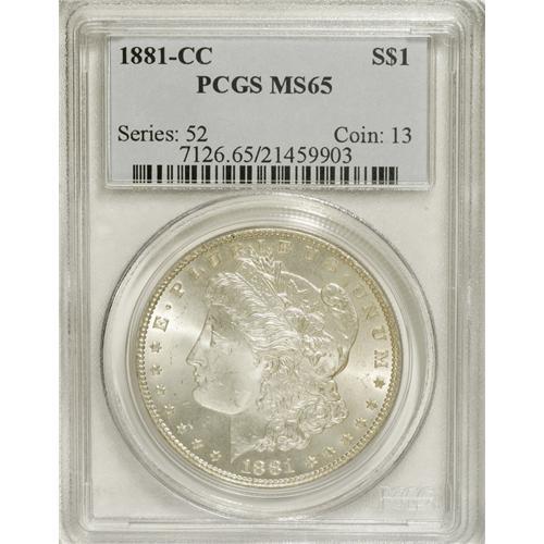 <B>1881-CC S$1 MS65 PCGS.</B></I> Delicate chestnut-gold toning visits this lustrous and impressively smooth Gem. The devices are intricately struck, and the eye appeal is exceptional for the grade.<BR><BR><b>Shipping:</b> Coins & Currency (<a target="_blank" href="http://www.heritageauctions.com/common/shipping.php">view shipping information</a>)