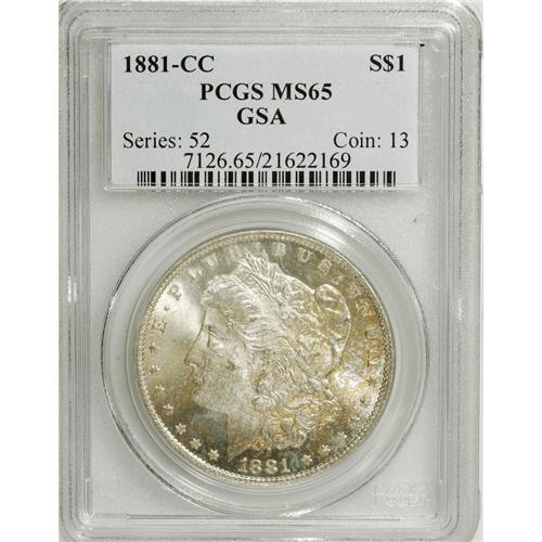 1881-CC S$1 MS65 PCGS. Ex: GSA. Pale peach and gold bl