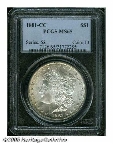 <B>1881-CC<S$1> MS65 PCGS.</B></I> Light gold color visits the left borders of this highly lustrous and well struck Gem. A low mintage Carson City issue, not often encountered with such exceptional eye appeal.