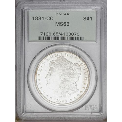 <B>1881-CC<img border='0' src='http://www.heritagecoins.com/images/star.gif' width=10 height=10>$1> MS65 PCGS.</B></I> Light tan toning along the right obverse border denies full brilliance, but this lustrous and crisply struck Gem is unblemished aside from light marks on the neck. Certified in a green label holder. <BR><BR><B>Important notice:</B> Heritage usually auctions material at the rate of 200-250 lots per hour. On some occasions eBay Live bid software or the Internet may not be able to keep up with the pace of the auction. We recommend placing a realistic absentee bid now as insurance to avoid disappointment. Occasionally the auctioneer may eliminate or reject an eBay Live bid, and the auctioneer may also reopen a lot after the close of the eBay live bidding (usually because we missed an audience bid), and may reject your bid even if it shows you as the winning bidder. By bidding via eBay Live, you agree that Heritage may award the lot to another bidder at its sole discretion under the circumstances described above or any other reasonable circumstances. Since eBay bids are not shown to us until we open the lot on the floor, we treat those bids just like floor bids. In most cases the floor responds before the eBay bid is presented to us, due to Internet lag time, so for consistency we have made it a policy that floor bids are always considered first over tie eBay live bids. Also please note that all Heritage lots purchased through eBay Live carry a 20% Buyer's Premium. Please make sure you read the Terms and Conditions before you bid. This lot is being auctioned in conjunction with a live floor auction by Heritage Galleries & Auctioneers. All final auction and invoice information will be supplied by Heritage Galleries & Auctioneers, and all other information should be considered preliminary. Lot:3309 <BR><BR><B>Winning Notification and Billing:</B> After the FINAL session in this auction is complete, Heritage will send e-mail and snail mail invoices. This process normally takes several days. All final auction and invoice information will be supplied by Heritage Galleries & Auctioneers, and all other information should be considered preliminary. <BR><BR>This auction will be conducted on a live auction floor and over the Internet through eBay Live. If you choose to place an absentee bid, please take a moment to <font color='#0000ff'><u><a href='http://pages.ebay.com/liveauctions/help/before/laabsentee.html'>learn how eBay Live absentee bidding works</a></u></font><font color='#000000'>