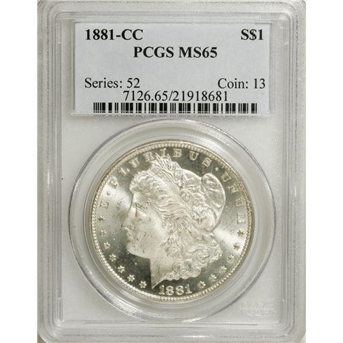 <B>1881-CC S$1 MS65 PCGS.</B></I> The 1881-CC is a low-mintage date (296,000 pieces), yet is relatively easy to find today in Mint State condition, due to the dispersal of former Treasury holdings (David Bowers, 2006). That said, this is a particularly nice Gem specimen in the current lot. Semi-prooflike fields accent the frosty, sharply struck design features, and essentially untoned surfaces are devoid of significant marks.<BR><BR><b>Shipping:</b> Coins & Currency (<a target="_blank" href="http://www.heritageauctions.com/common/shipping.php">view shipping information</a>)