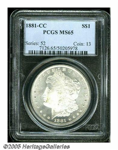 <B>1881-CC<S$1> MS65 PCGS.</B></I> This is a wonderful Gem example with frosty devices and satiny fields. A splash of light brown toning is visible on the obverse of this otherwise fully brilliant white dollar.