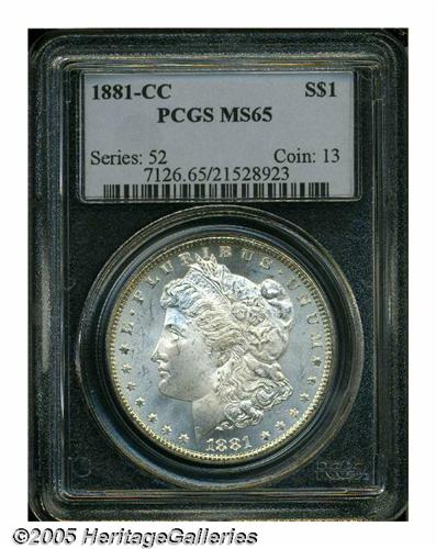 <B>1881-CC<S$1> MS65 PCGS.</B></I> Well struck with bright, frosty luster, amazingly flashy fields, and a few scattered, minor marks. Essentially untoned, with attractive golden rim toning on both sides.