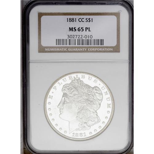 <B>1881-CC<img border='0' src='http://www.heritagecoins.com/images/star.gif' width=10 height=10>$1> MS65 Prooflike NGC.</B></I> VAM-2. Well struck and exceedingly frosty, with sharp contrast between the fields and the devices. Flashy and fully brilliant, with a minor scrape in the left obverse field and a few other small, scattered blemishes and luster grazes that prevent an even higher grade designation. An extremely attractive prooflike Gem.