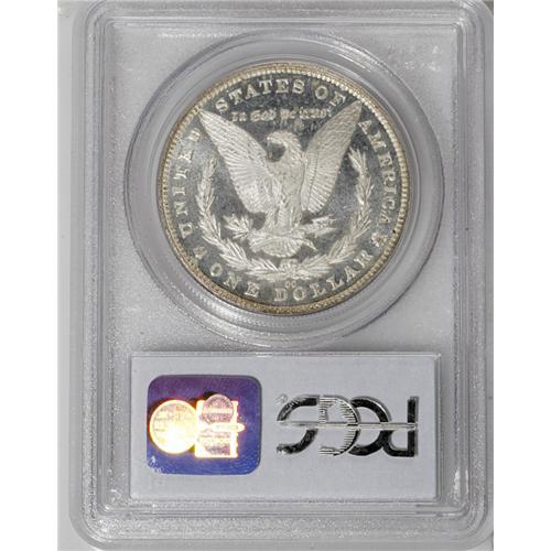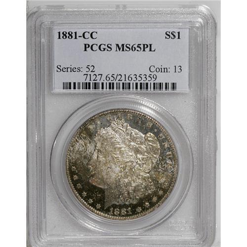 <B>1881-CC<img border='0' src='http://www.heritagecoins.com/images/star.gif' width=10 height=10>$1> MS65 Prooflike PCGS.</B></I> The wispy toning of the reverse pales in comparison to the variegated obverse toning, in which gunmetal and russet dominate. Moderately mirrored, lightly frosted, boldly struck, and fully Gem.