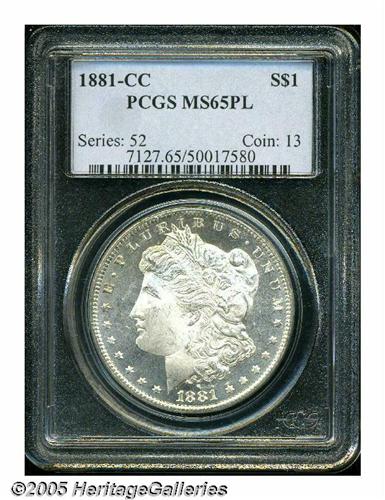 <B>1881-CC<S$1> MS65 Prooflike PCGS.</B></I> Well struck with bright, untoned, extremely frosty surfaces that only show a couple of shallow luster grazes, on the obverse, and a handful of minor contact marks on the reverse. Lovely cameo contrast is evident, on both sides of this Prooflike Gem.