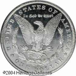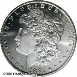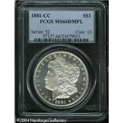 1881-CC S$1 MS66 Deep Mirror Prooflike PCGS. A mag <B>1881-CC S$1 MS66 Deep Mirror Prooflike PCGS.</B></I> A magnificent deeply mirrored and virtually untoned premium Gem that displays spectacular cameo contrast between the frosty devices and the flashy, undisturbed fields. The outstanding eye appeal ensures that a strong bid will be required to win this exceptional Carson City Silver Dollar. Population: 37 in 66 Deep Mirror Prooflike, 0 finer (10/04). <BR><BR><B>Important notice:</B> Heritage usually auctions material at the rate of 200-250 lots per hour. On some occasions eBay Live bid software or the Internet may not be able to keep up with the pace of the auction. We recommend placing a realistic absentee bid now as insurance to avoid disappointment. Occasionally the auctioneer may eliminate or reject an eBay Live bid, and the auctioneer may also reopen a lot after the close of the eBay live bidding (usually because we missed an audience bid), and may reject your bid even if it shows you as the winning bidder. By bidding via eBay Live, you agree that Heritage may award the lot to another bidder at its sole discretion under the circumstances described above or any other reasonable circumstances. Since eBay bids are not shown to us until we open the lot on the floor, we treat those bids just like floor bids. In most cases the floor responds before the eBay bid is presented to us, due to Internet lag time, so for consistency we have made it a policy that floor bids are always considered first over tie eBay live bids. Also please note that all Heritage lots purchased through eBay Live carry a 20% Buyer's Premium. Please make sure you read the Terms and Conditions before you bid. This lot is being auctioned in conjunction with a live floor auction by Heritage Galleries & Auctioneers. All final auction and invoice information will be supplied by Heritage Galleries & Auctioneers, and all other information should be considered preliminary. Lot:7391