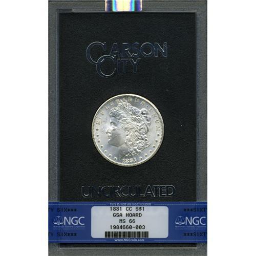 <B>1881-CC<img border='0' src='http://www.heritagecoins.com/images/star.gif' width=10 height=10>$1 MS66 NGC.</B></I> An arc of medium golden-brown and olive toning graces the upper reverse of this lustrous and exquisitely struck premium Gem. Well preserved, and popular due to its Carson City mintmark and low mintage.