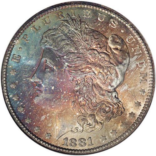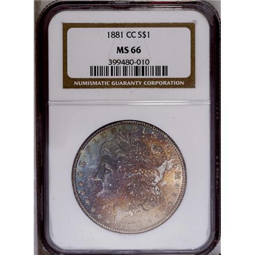 <B>1881-CC<img border='0' src='http://www.heritagecoins.com/images/star.gif' width=10 height=10>$1> MS66 NGC.</B></I> This is a sharply struck Gem with full luster. The obverse exhibits colorful toning over the entire surface with champagne, gold, lilac, and blue. The reverse has traces of light gold toning near portions of the border, with the balance fully brilliant and frosty. Few finer examples of this date have been certified by NGC.