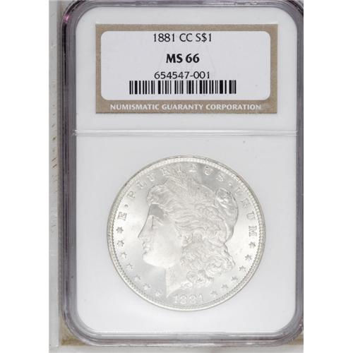 <B>1881-CC<img border='0' src='http://www.heritagecoins.com/images/star.gif' width=10 height=10>$1> MS66 NGC.</B></I> Well struck with extremely frosty stone-white surfaces that are exceptionally clean, especially on Liberty's cheek and on the eagle's breast. A few wispy marks are noted on the neck and chin.