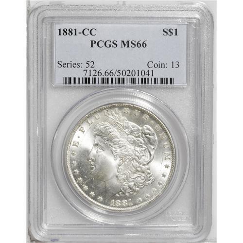 <B>1881-CC<img border='0' src='http://www.heritagecoins.com/images/star.gif' width=10 height=10>$1> MS66 PCGS.</B></I> A lustrous and sharply struck Premium Gem, essentially untoned with some mellowed gray on the reverse. Great eye appeal with clean devices.