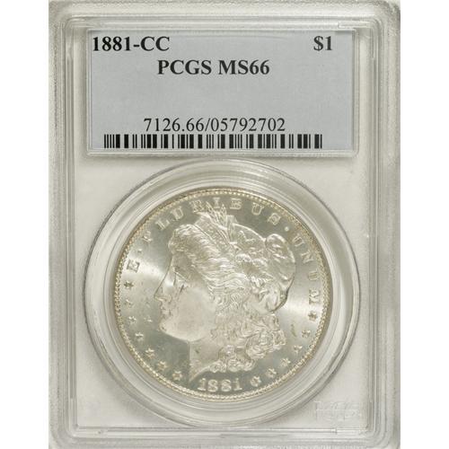 <B>1881-CC S$1 MS66 PCGS.</B></I> A semi-prooflike and virtually brilliant Premium Gem whose sharply struck devices and clean surfaces ensure the eye appeal. A popular low mintage CC-mint issue.<BR><BR><b>Shipping:</b> Coins & Currency (<a target="_blank" href="http://www.heritageauctions.com/common/shipping.php">view shipping information</a>)