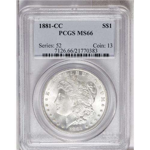 <B>1881-CC<img border='0' src='http://www.heritagecoins.com/images/star.gif' width=10 height=10>$1> MS66 PCGS.</B></I> A sharply struck example of this date that exhibits the most modest hint of amber haze just beginning to emerge upon superb surfaces of satiny frost.