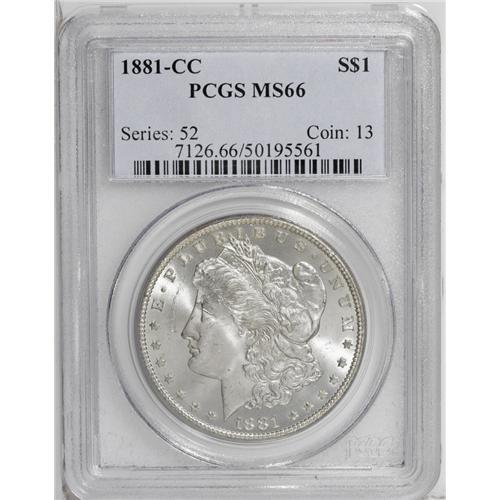 <B>1881-CC<img border='0' src='http://www.heritagecoins.com/images/star.gif' width=10 height=10>$1> MS66 PCGS.</B></I> An thick layer of sparkling mint frost covers both sides of this snow-white premium Gem. Sharply struck and exquisitely preserved, with minor luster grazing on the portrait and in the left obverse field.