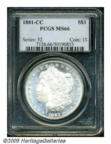 <B>1881-CC<S$1> MS66 PCGS.</B></I> Boldly struck, untoned, and very frosty, with beautiful shimmering surfaces that are free of large marks and only display a few superficial luster grazes in the fields and on Liberty's face. Faint roller marks (as struck) cross over Liberty's ear.