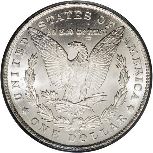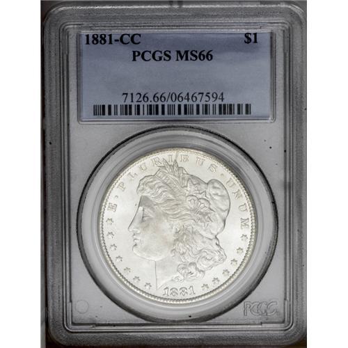 <B>1881-CC<img border='0' src='http://www.heritagecoins.com/images/star.gif' width=10 height=10>$1> MS66 PCGS.</B></I> Frosty luster illuminates snow-white surfaces displaying sharply struck features. A mild luster graze is located on Liberty's cheekbone, and a few trivial contact marks are scattered over each side, but the Premium Gem grade assessment seems beyond debate.