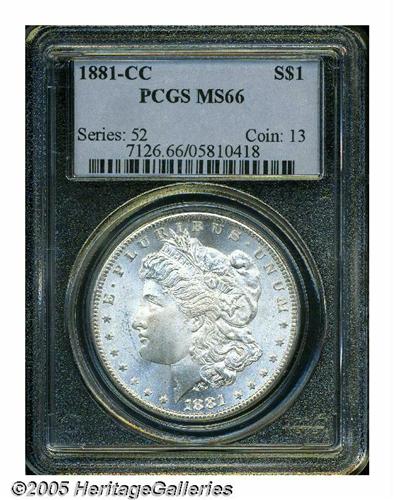 <B>1881-CC<S$1> MS66 PCGS.</B></I> Highly frosted surfaces coupled with minimally abraded, well defined devices give this essentially white Carson City dollar an amazing eye appeal.