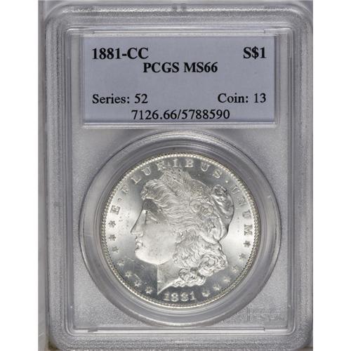 <B>1881-CC<img border='0' src='http://www.heritagecoins.com/images/star.gif' width=10 height=10>$1> MS66 PCGS.</B></I> Light frosting on the well struck devices complements the lightly toned, lustrous surfaces. An attractive and minimally marked Carson City dollar.<BR><I>From The Chicago-Ark Collection.</B></I>