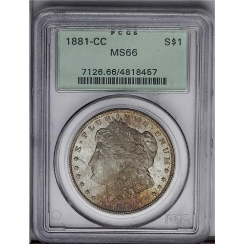 <B>1881-CC<img border='0' src='http://www.heritagecoins.com/images/star.gif' width=10 height=10>$1> MS66 PCGS.</B></I> Sharply struck and highly lustrous with a smudge of golden-brown toning at the bottom of the obverse.