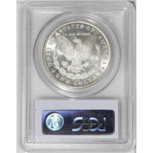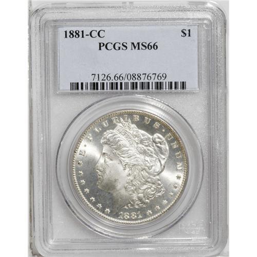 <B>1881-CC<img border='0' src='http://www.heritagecoins.com/images/star.gif' width=10 height=10>$1> MS66 PCGS.</B></I> Sharply struck for this issue with pleasing and rather frosty luster. Small patches of the untoned surfaces near the periphery have prooflike reflectivity.