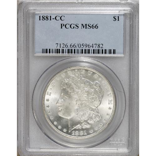 <B>1881-CC S$1 MS66 PCGS.</B></I> Solidly struck with a smooth, frosty appearance. A few trifling parallel grazes appear on the chin, but the surfaces have only a handful of marks elsewhere. One of just 296,000 pieces coined.<BR><BR><b>Shipping:</b> Coins & Currency (<a target="_blank" href="http://www.heritageauctions.com/common/shipping.php">view shipping information</a>)