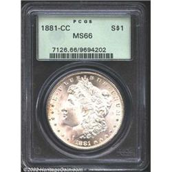 1881-CC S$1 MS66 PCGS. The borders have just a hint of gold patina. A flashy and well struck Gem with exceptional preservation. A popular low mintage CC issue. Important notice: We expect to be auctioning lots at the rate of 200-250 per hour. Sometimes eBay Premier live bid software cannot keep up with that pace, so we strongly recommend that you place a realistic proxy bid now as insurance to avoid disappointment. Also please note that all Heritage/CAA lots purchased through eBay Premier carry a 20% Buyer's Premium. Please make sure you read the Terms and Conditions.
