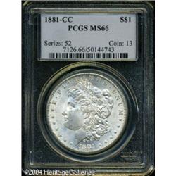 1881-CC S$1 MS66 PCGS. This CC dollar is crisply s <B>1881-CC S$1 MS66 PCGS.</B></I> This CC dollar is crisply struck throughout, and exudes strong luster from nearly untoned surfaces. A few minor scuffs on Liberty's cheek are mentioned for accuracy. <BR><BR><B>Important notice:</B> Heritage usually auctions material at the rate of 200-250 lots per hour. On some occasions eBay Live bid software or the Internet may not be able to keep up with the pace of the auction. We recommend placing a realistic absentee bid now as insurance to avoid disappointment. Occasionally the auctioneer may eliminate or reject an eBay Live bid, and the auctioneer may also reopen a lot after the close of the eBay live bidding (usually because we missed an audience bid), and may reject your bid even if it shows you as the winning bidder. By bidding via eBay Live, you agree that Heritage may award the lot to another bidder at its sole discretion under the circumstances described above or any other reasonable circumstances. Since eBay bids are not shown to us until we open the lot on the floor, we treat those bids just like floor bids. In most cases the floor responds before the eBay bid is presented to us, due to Internet lag time, so for consistency we have made it a policy that floor bids are always considered first over tie eBay live bids. Also please note that all Heritage lots purchased through eBay Live carry a 20% Buyer's Premium. Please make sure you read the Terms and Conditions before you bid. This lot is being auctioned in conjunction with a live floor auction by Heritage Galleries & Auctioneers. All final auction and invoice information will be supplied by Heritage Galleries & Auctioneers, and all other information should be considered preliminary. Lot:7385